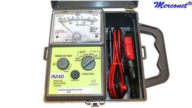 De IM40 is een analoge isolatie tester met een bereik tot 50 MOhm. De IM40 heeft een nulstellingsknop voor de weerstand. De IM40 heeft drie isolatie testspanningen en twee continuïteitsbereiken. De IM40 heeft een duidelijk afleesbaar display. Er is een visuele indicatie voor actieve aansluitingen. De IM40 MegOhmr isolatiemeter is beschermd tegen een overspanning van CAT III 600 Volt. De IM40 heeft een stevige kunststof behuizing.