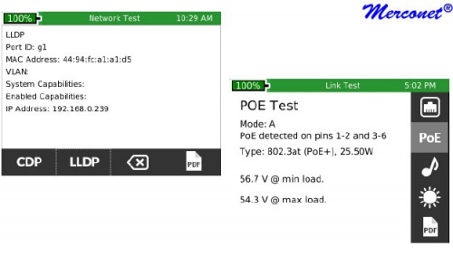 POE (Power Over Ethernet) er wordt op het vermogen getest en de correcte pennen. Port discovery, half, full duplex en snelheid. Ping testen met round trip tijden. CDP (Cisco Discovery Protocol) of LLDP ( Link Layer Discovery Protocol. VLAN discovery. Traceroute voor het pad van de verbinding. Al deze data wordt opgeslagen en kan naar een PC gestuurd worden voor rapportage en analyse.